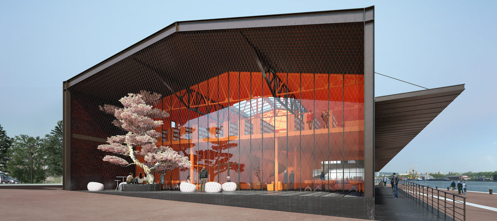 Des programmes de détente et d’accueil répartis dans des espaces bruts, rassemblés sous de petites structures légères, dynamisant la nef.