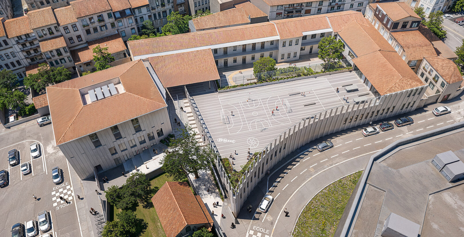 Enclavé entre le vieux village et les ilots récemment construits, le groupe scolaire est le symbole d’un quartier qui évolue.